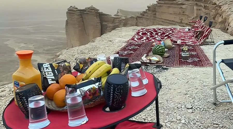 Our private edge of the world tour ensures an unforgettable evening, creating cherished memories. Book now to transform your edge of the world saudi arabia into an enchanting and private dining adventure, making your visit truly extraordinary. As the sun sets over the mesmerizing cliffs, relish exquisite dining and personalized service. The luxurious private dinner in Edge of the World Riyadh provides you with delicious cuisine in the backdrop of the cliffs.