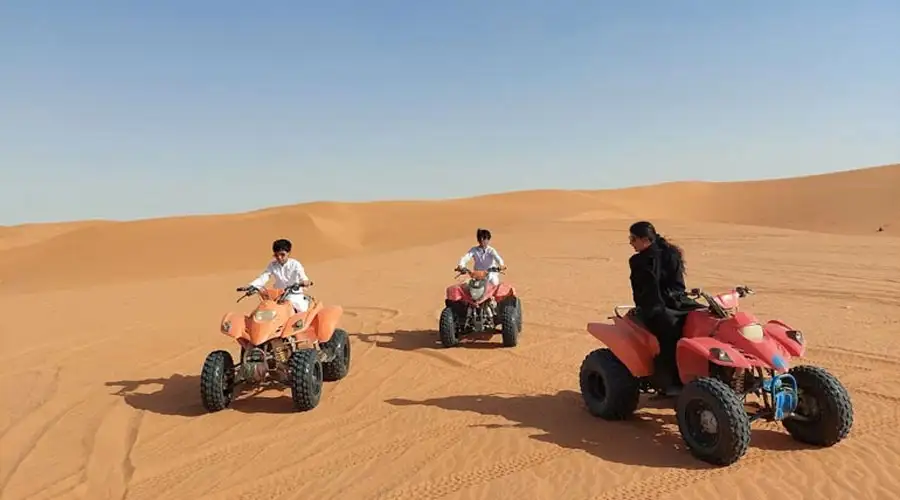 Riyadh desert quad biking comes with everything you need for a smooth and thrilling experience. Your journey starts when you're picked up - whether at your hotel, a mall, or Riyadh airport, you'll be transported in a 4x4 car into the endless desert. Take a ride with our experienced tour guide, who will take you to our versatile quad bike tour Riyadh rental location. We'll keep you safe while exuding enthusiasm. To keep you energetic, we'll also provide water and soft drinks throughout the adventure.