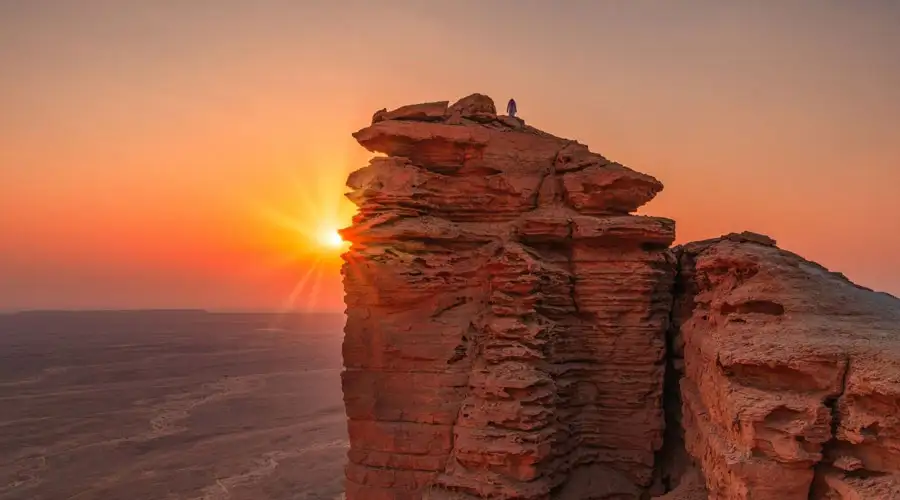 Watching the sunrise Riyadh is truly a magical experience. Start your day with the popular Sunrise Edge of the world tour that will take you to visit Jebel Fihrayn, a 1.31-meter-tall cliff that is part of the 800 kilometer long Tuwaik mountain range. The distance of the Sunrise view at Edge of the world tour Riyadh from the city is approximately 100 kilometers. The sunrise in Riyadh is a beautiful experience, with golden hues spreading across the horizon, painting the desert sky in orange, yellow, pink, and red colors.